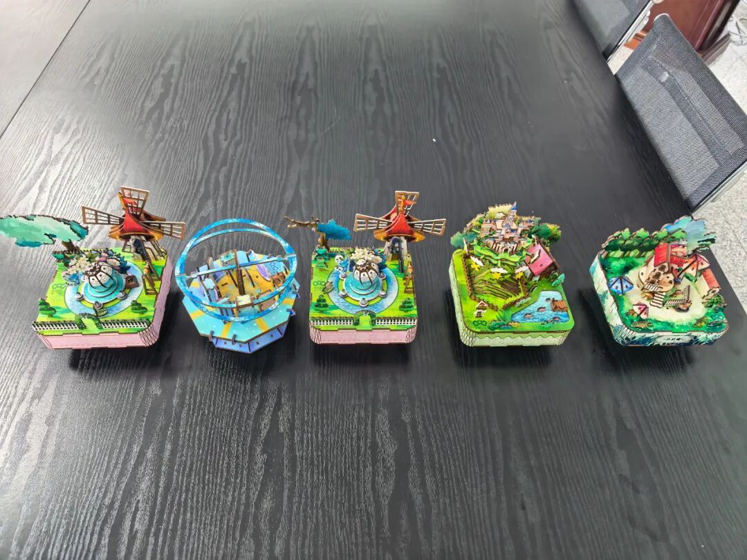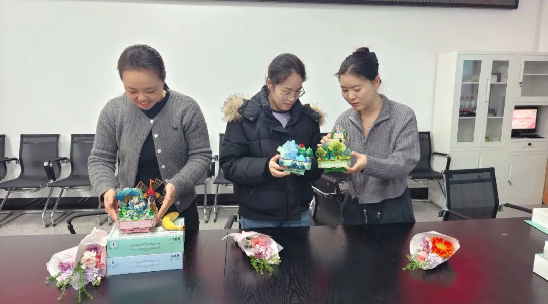 合影过后,“DIY八音盒”活动正式拉开序幕。女职工们围坐在一起,在花香与欢声笑语中,认真研究组件、细心拼接组装。从齿轮咬合到外壳拼接,从装饰点缀到调试发声,大家相互交流技巧、分享创意,指尖流转间,一个个独具匠心的八音盒逐渐成型。随着清脆悠扬的旋律在现场不断回响,每个人的脸上都洋溢着幸福的笑容,疲惫在创作的乐趣中悄然消散。