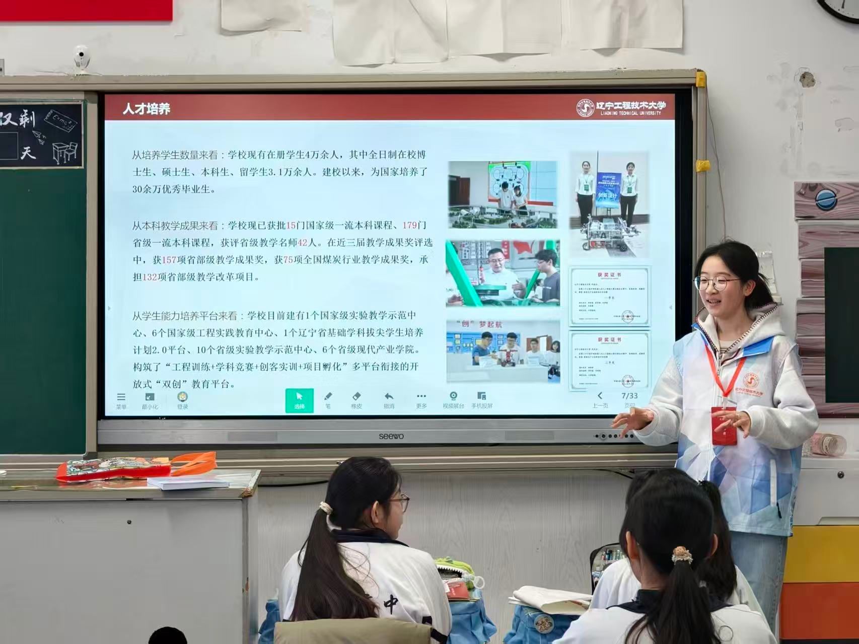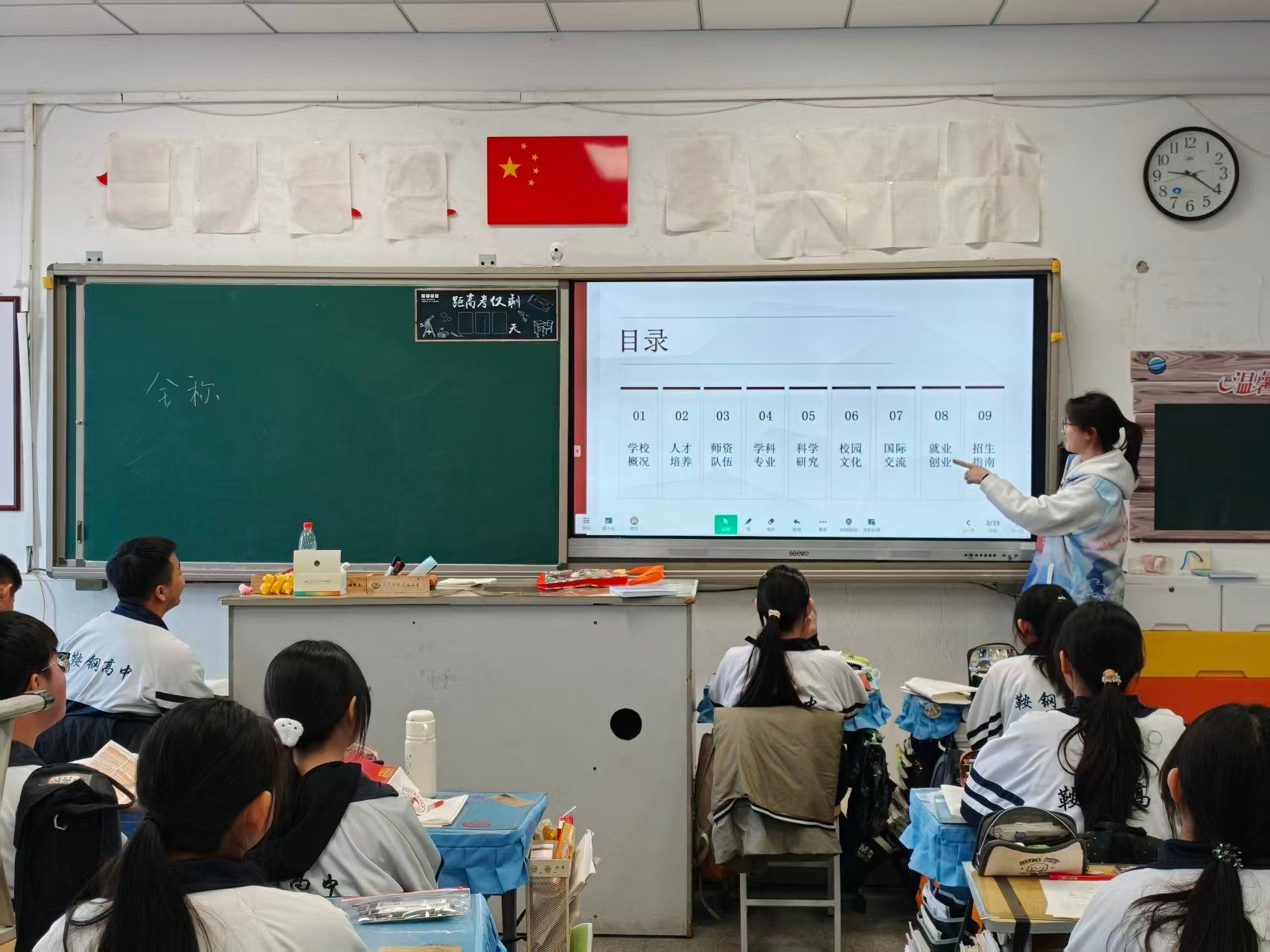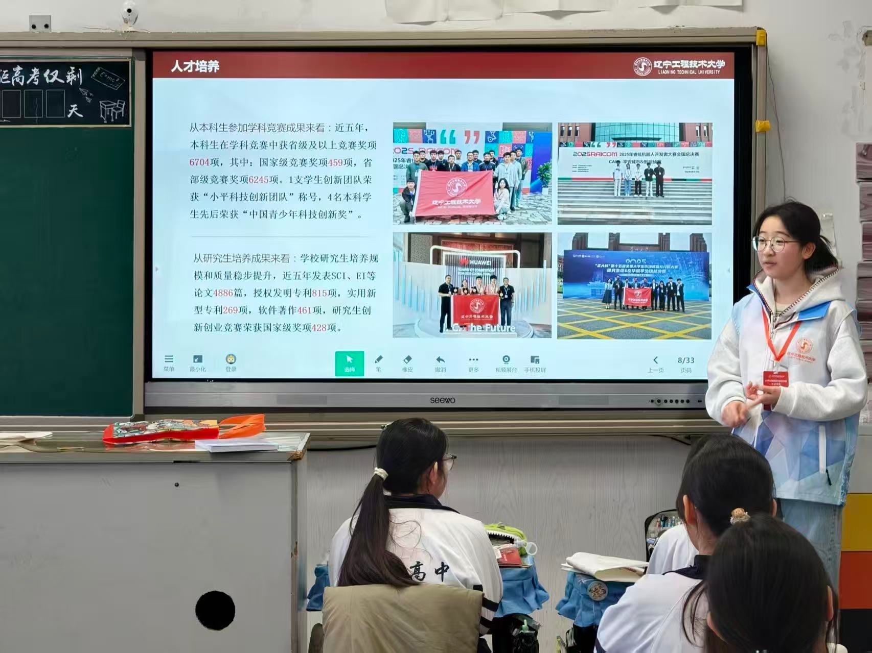 活动当天,于文浠同学走进鞍钢高级中学的课堂,通过精心制作的PPT,系统介绍了学校的办学历史、学科优势及人才培养特色。她结合自己的高考经验和大学感悟,分享了备考心得、专业选择思路以及在辽工程的成长故事。现场互动热烈,学弟学妹们踊跃提问,对辽工程表现出浓厚的兴趣。